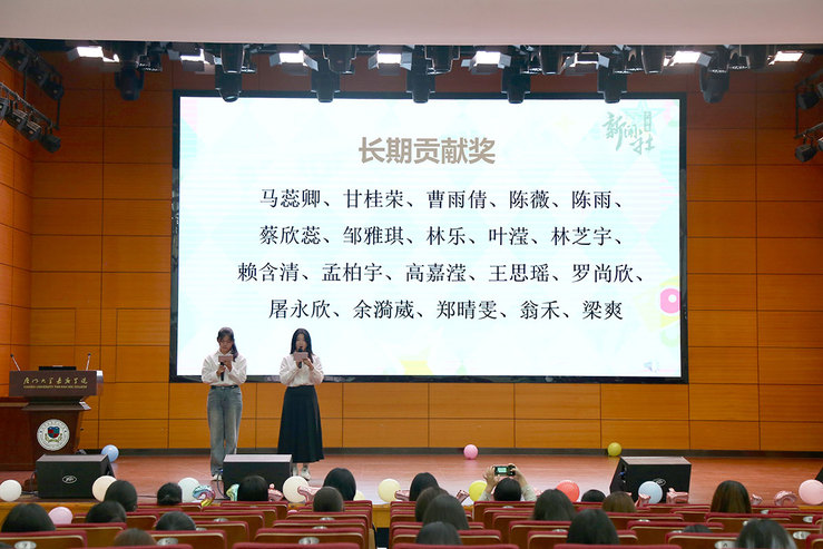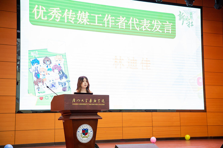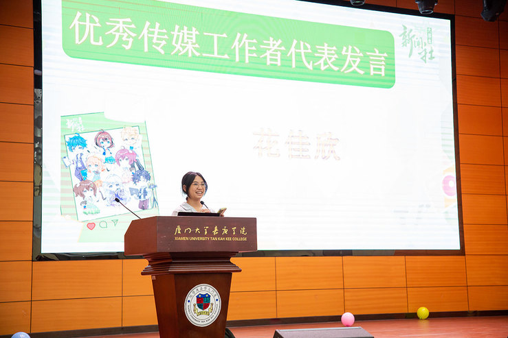 视频工作室林迪佳、广播电台编辑部花佳欣作为优秀传媒工作者获奖代表先后发言。林迪佳以三次被“拯救”的亲身经历,讲述了在视频工作室从走出情绪低谷、学会分工合作到收获温暖情谊的蜕变历程。她坦言,新闻社不仅是技能成长的平台,更是给予力量与陪伴的大家庭,鼓励全体社员以热爱为光,用镜头记录青春,以影像传递力量。花佳欣则从广播电台严谨细致的工作流程切入,分享了从青涩新手到独当一面骨干的成长轨迹。她表示,“这一路走来,每一步都算数,每一份付出都在悄悄塑造着更好的我们”。